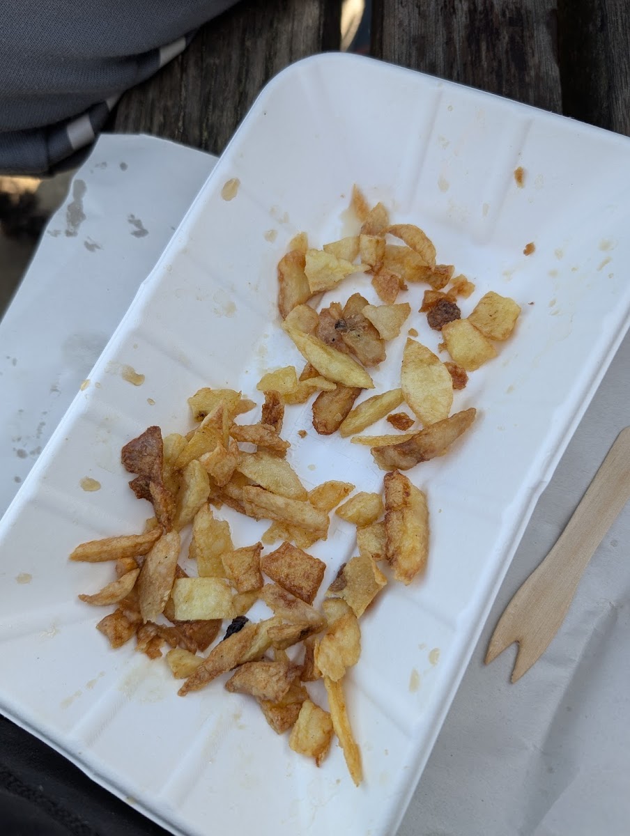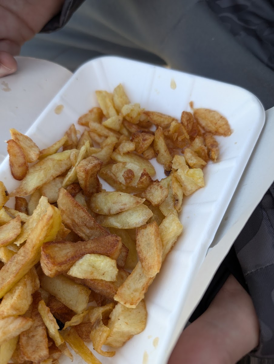 Ok chips. Started nice. Chunky cooked chips. Then after eating top few under were some overly cooked chips then lots little scrappy bits. £3 takeaway portion